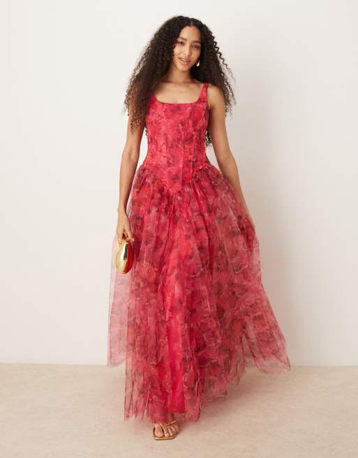 Lace & Beads – Gorsetowa sukienka maxi z obniżoną linią talii, w różowe i czerwone róże