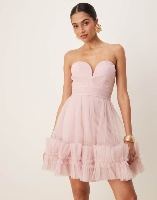 Lace & Beads – Jasnoróżowa tiulowa sukienka mini z dekoltem w kształcie serca i falbanką na dole