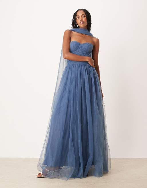 Lace & Beads – Niebieska gorsetowa sukienka maxi z tiulu z szalikiem