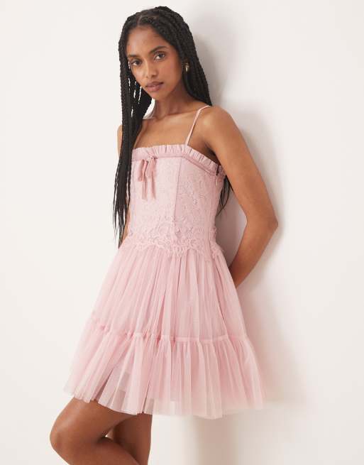 Lace & Beads – Pasteloworóżowa tiulowa sukienka mini z gorsetem i wiązaniem