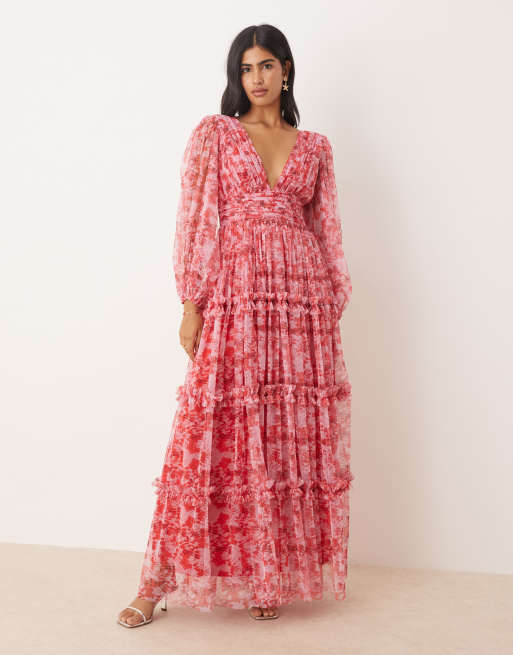 Lace & Beads – Sukienka maxi z długimi rękawami w czerwono-różowy kwiatowy wzór