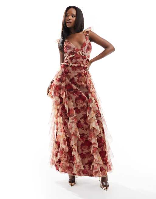 Lace & Beads – Sukienka midaxi z falbankami we wzór w róże