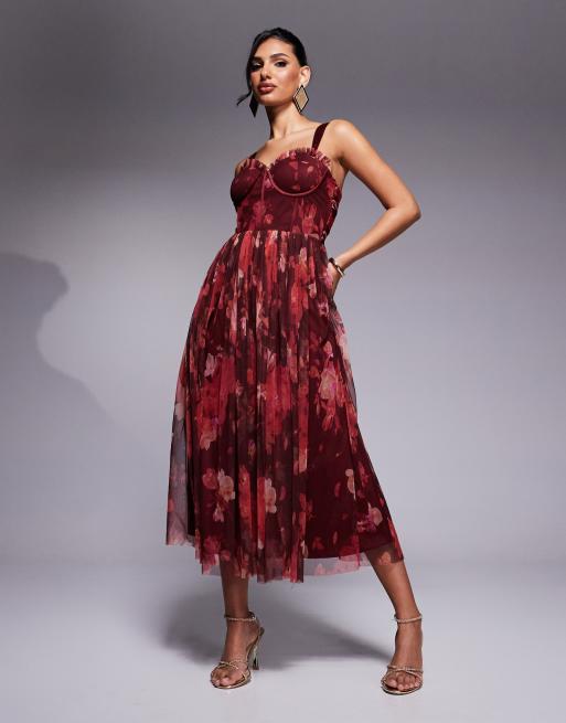 Lace & Beads – Tiulowa gorsetowa sukienka midaxi we wzór w ciemnoczerwone róże