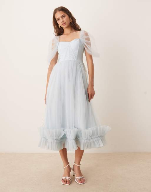 Lace & Beads – Warstwowa błękitna sukienka midaxi z falbankami