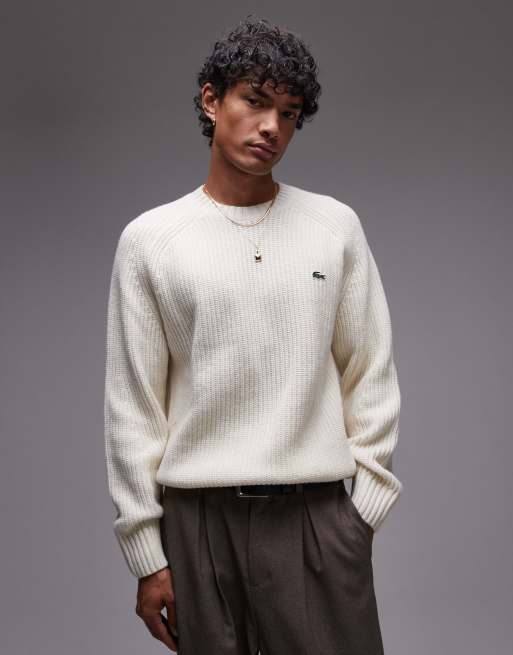 Lacoste – Gruby sweter w kolorze złamanej bieli z dzianiny o warkoczowym splocie