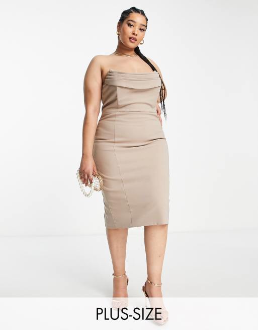 Lavish Alice Plus – Kamiennobeżowa sukienka ołówkowa midi z drapowanym dekoltem bandeau