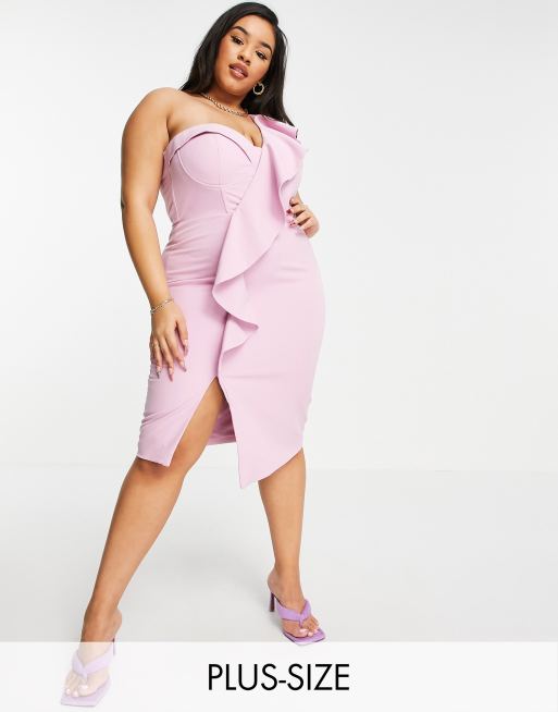 Lavish Alice Plus – Różowa drapowana sukienka midi na jedno ramię z gorsetem i falbanką