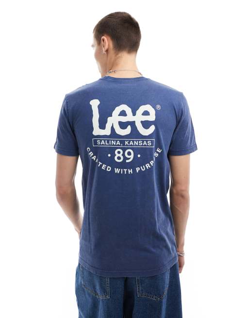 Lee – Ciemnoniebieski T-shirt z falistym logo i napisem na plecach