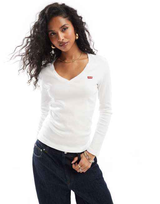 Levi's – Biały T-shirt z długimi rękawami i dekoltem w serek z małym logo batwing