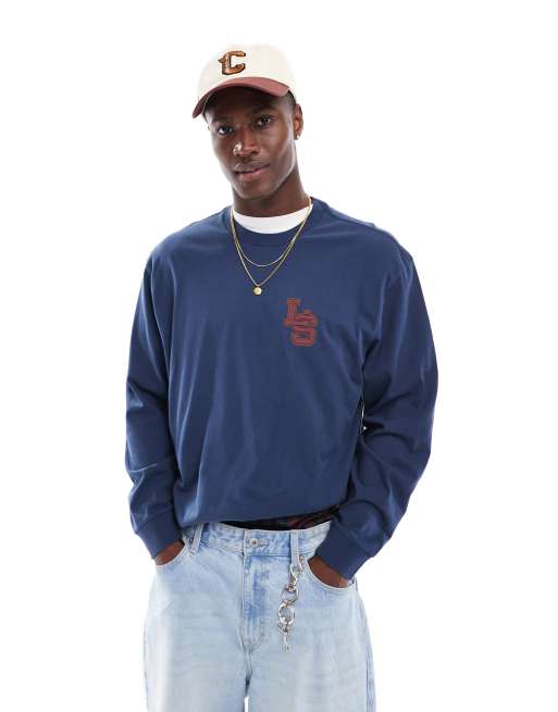 Levi's – Klasyczny granatowy T-shirt o luźnym kroju z długim rękawem i monogramem w uczelnianym stylu