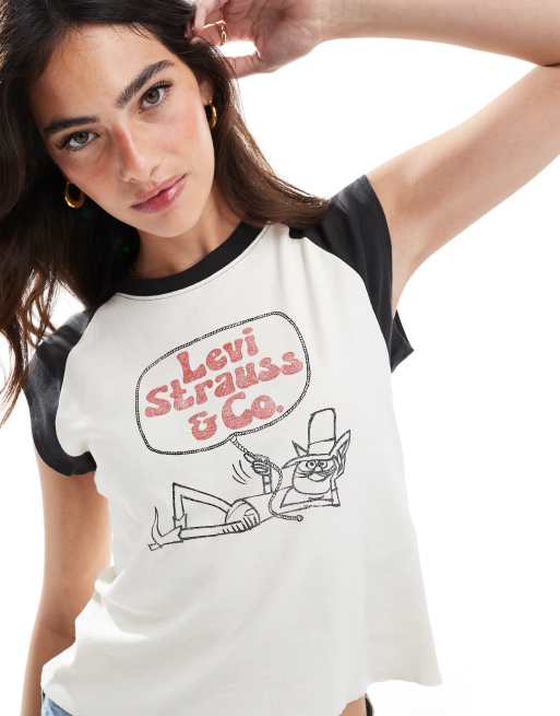 Levi's – Kremowy T-shirt bez rękawów w baseballowym stylu z nadrukiem z kotem kowbojem