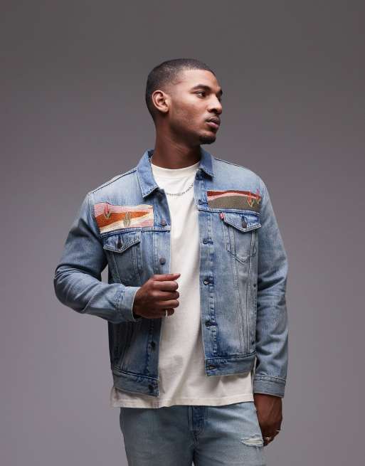 Levi's – Niebieska jeansowa kurtka trucker z haftowanym krajobrazowym wzorem, czapka trucker, część zestawu