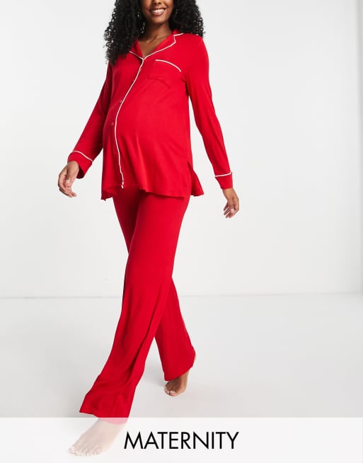 Lindex Maternity – Czerwona piżama: top z kołnierzykiem kubańskim i spodnie