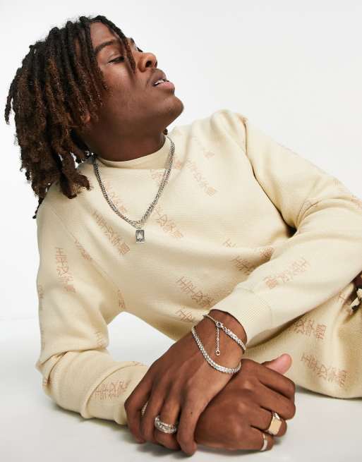 Liquor N Poker – Beżowy sweter dzianinowy oversize z japońskim nadrukiem tekstowym na całości