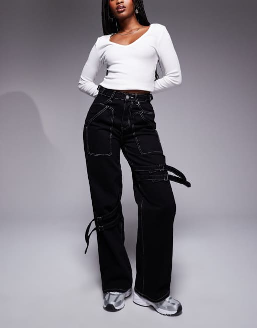 Liquor N Poker – Czarne jeansy z kontrastowymi szwami i ozdobną klamrą