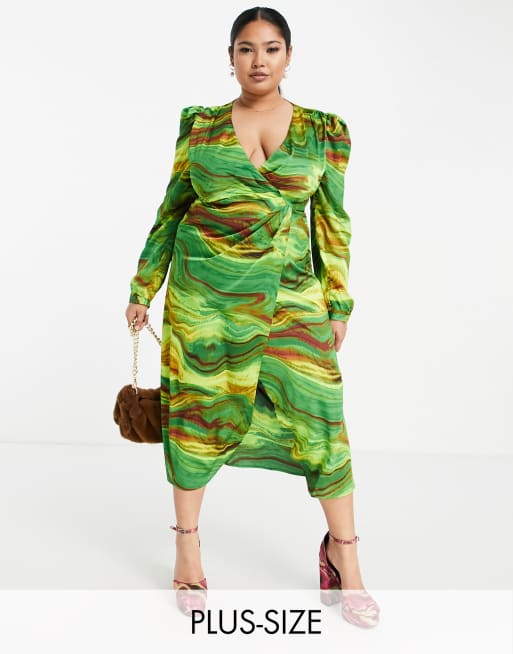 Liquorish – Kopertowa sukienka midi w zielony marmurkowy wzór