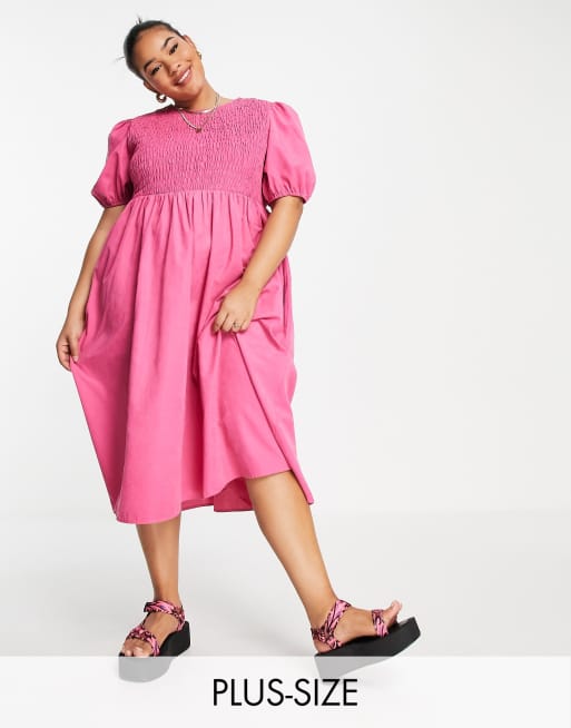 Lola May Plus – Różowa luźna sukienka midi z bufkami i marszczeniem