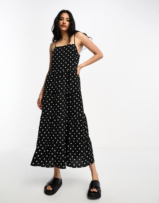 Lola May – Czarna trapezowa sukienka midi w groszki z kwadratowym dekoltem