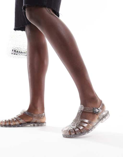 London Rebel – Płaskie gumowe buty w czarnym brokatowym kolorze