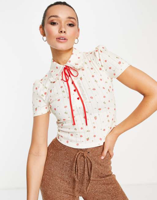 Lost Ink – Biały T-shirt polo we wzór w truskawki