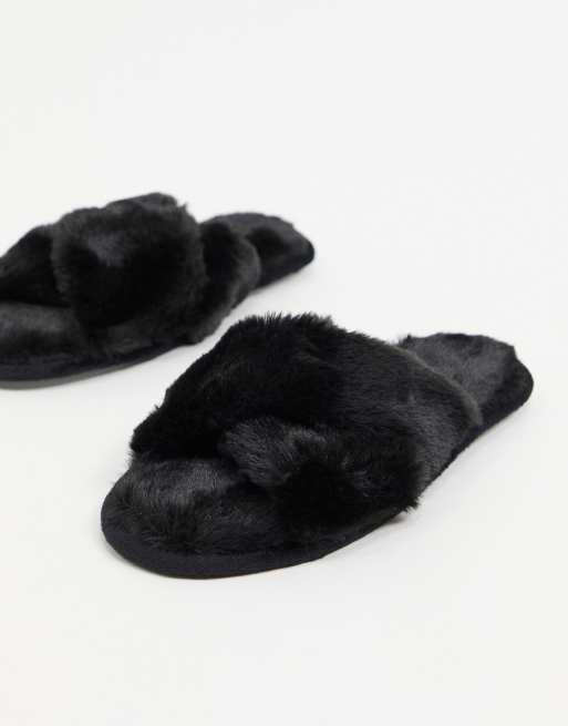 Loungeable – Czarne puszyste kapcie ze skrzyżowanymi paskami