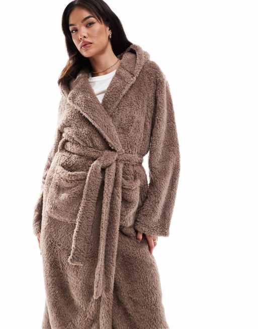 Loungeable – Czekoladowy przytulny szlafrok maxi z kapturem ze sztucznego kożuszka