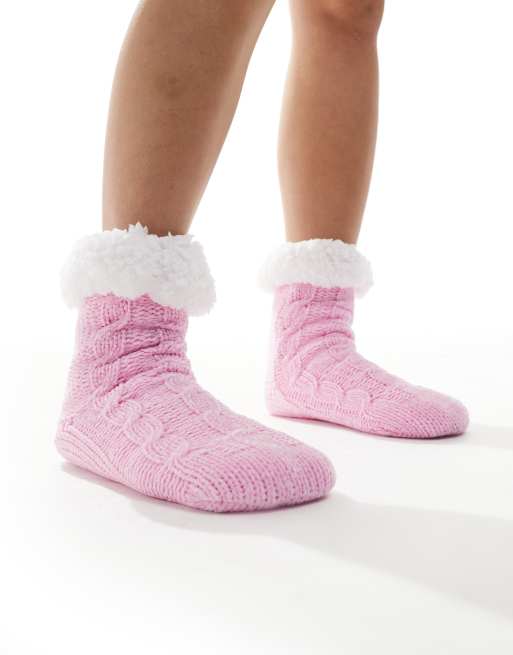 Loungeable – Jasnoróżowe szenilowe skarpetki-kapcie o warkoczowym splocie z podszewką z kożuszka
