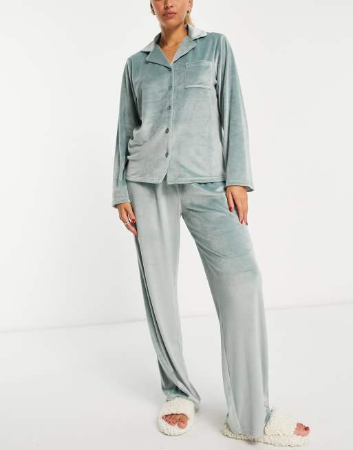 Loungeable – Szałwiowozielona bardzo miękka piżama z weluru z kołnierzykiem kubańskim