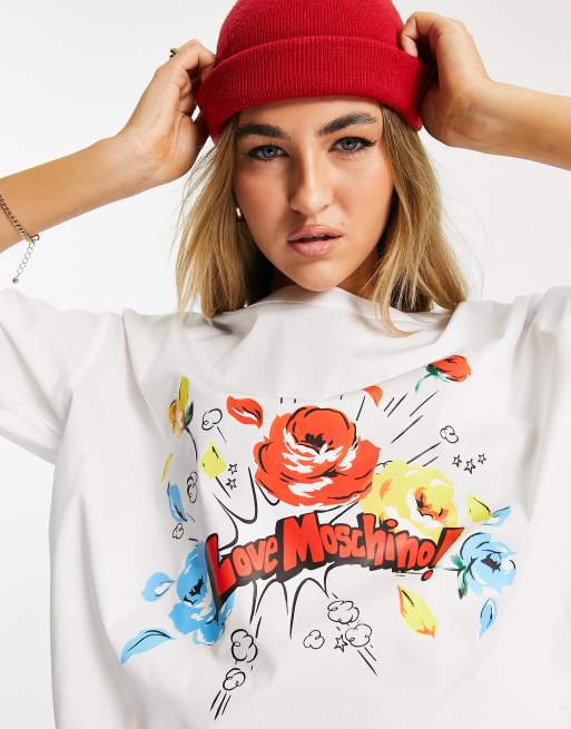 Love Moschino – Biały dzianinowy T-shirt z kwiatowym logo