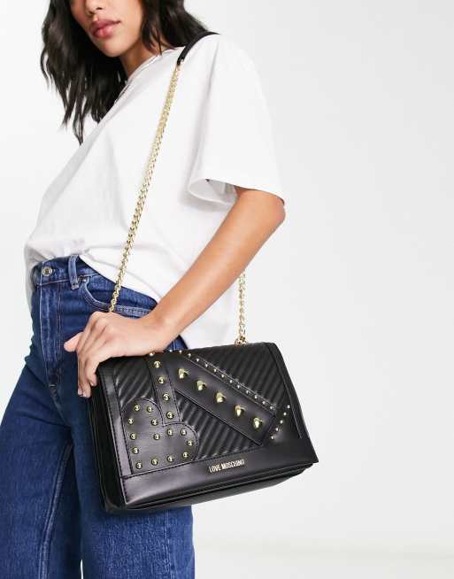 Love Moschino – Czarna torebka na ramię z klapą zdobioną ćwiekami