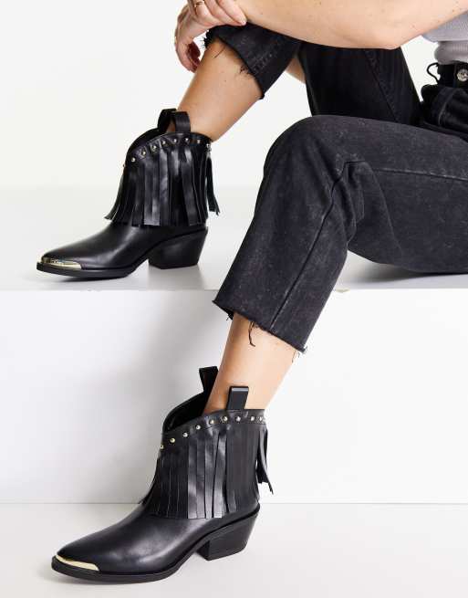 Love Moschino – Czarne kowbojki do kostki na obcasie z frędzlami