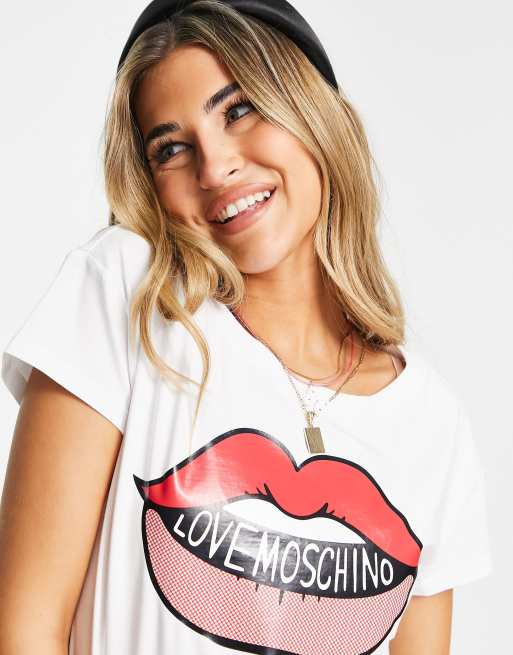 Love Moschino – Niebieski T-shirt z logo z motywem ust