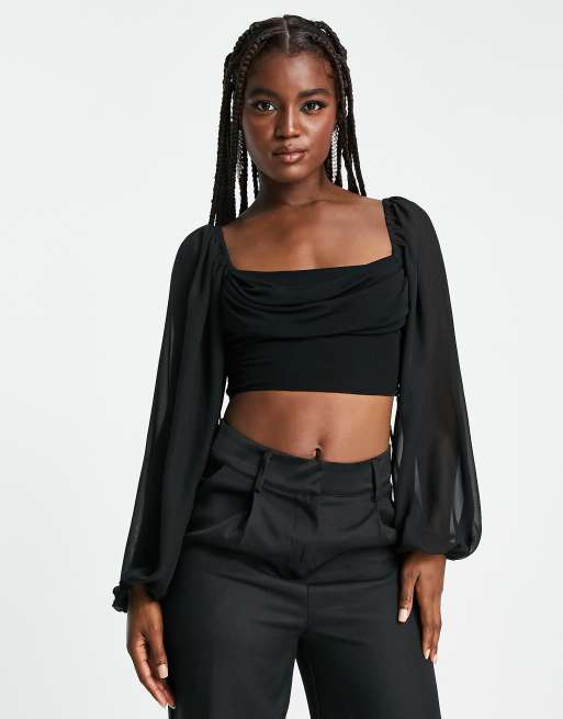 Love Triangle – Czarna bluzka z drapowanym dekoltem i prześwitującymi balonowymi rękawami