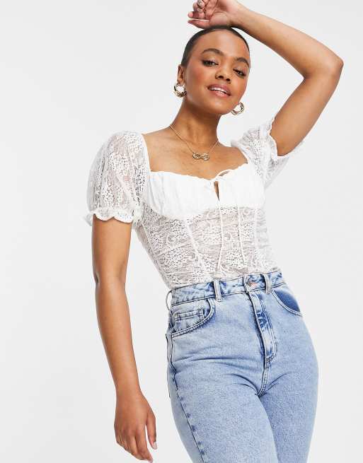 Love Triangle – Sznurowane na plecach białe koronkowe body z marszczeniem