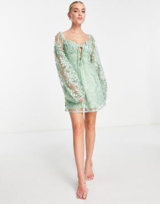 Love Triangle – Zielona koronkowa sukienka skater z bufkami i wzorem w liście