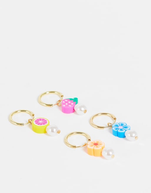 Madein – Zestaw 4 złocistych kolczyków-kółek z zawieszkami w kształcie owoców