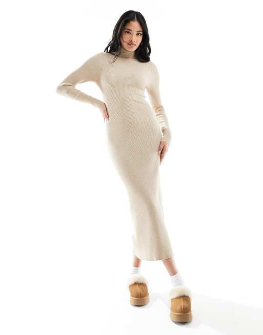 Mango – Beżowa dzianinowa sukienka midi z golfem