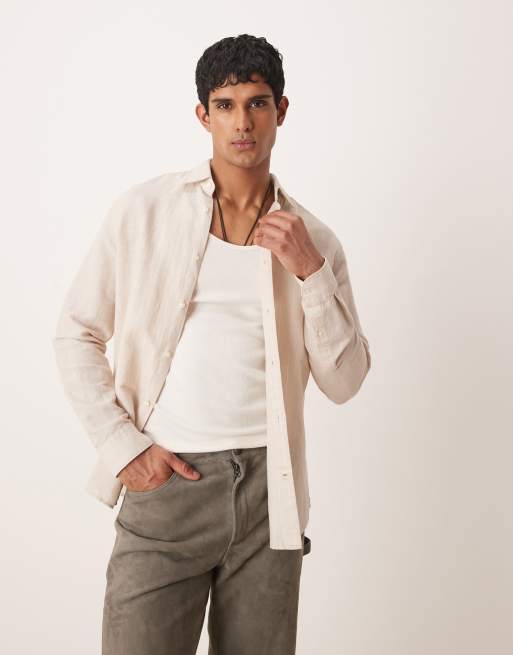 Mango – Beżowa koszula z długimi rękawami z domieszką lnu