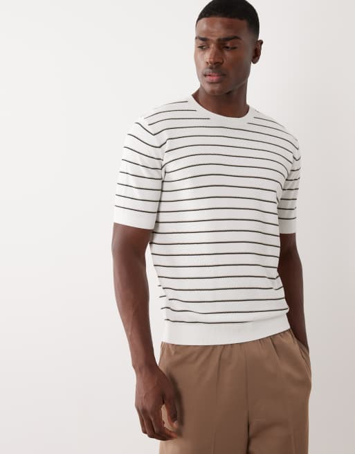 Mango – Beżowy T-shirt z delikatnej dzianiny w paski