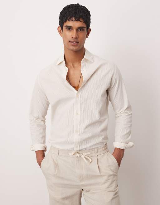 Mango – Biało-beżowa koszula z długimi rękawami z marszczonego materiału w paski