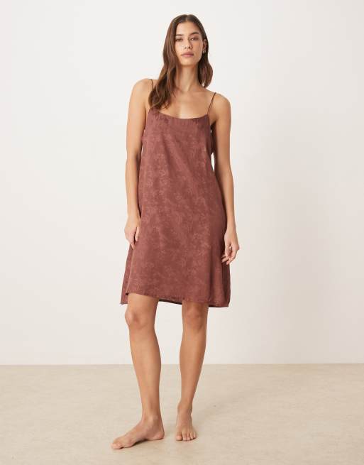 Mango – Brązowa satynowa sukienka na ramiączkach w żakardowy wzór