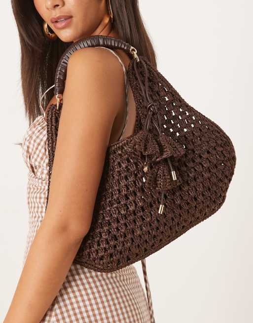 Mango – Brązowa szydełkowa torebka z zawieszkami w kształcie kwiatów