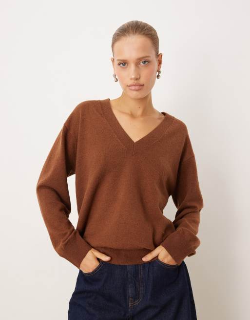 Mango – Brązowy dzianinowy top z dekoltem w szpic i długimi rękawami