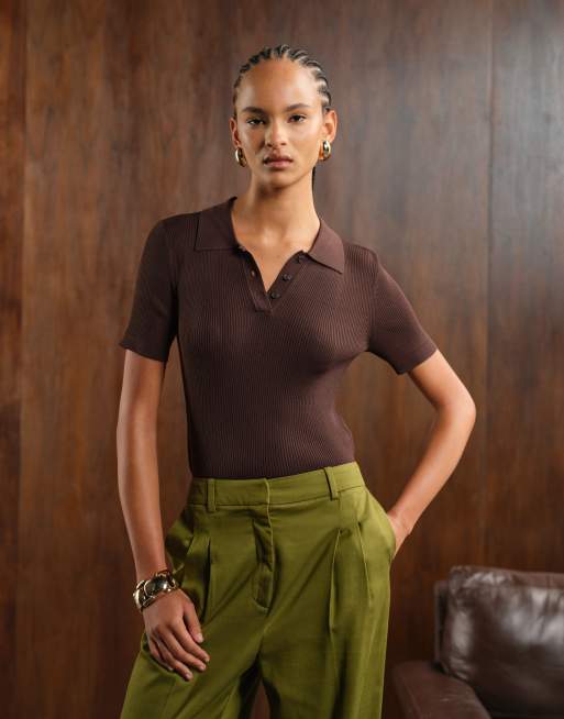 Mango – Brązowy dzianinowy top z kołnierzykiem polo z dekoltem w szpic i krótkimi rękawami