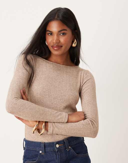 Mango – Brązowy prążkowany top z długimi rękawami