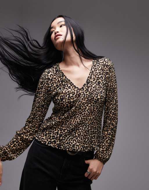 Mango – Brązowy top w drobną panterkę z dekoltem w szpic
