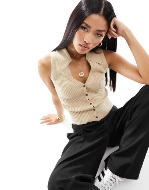 Mango – Brązowy zapinany z przodu na guziki top polo bez rękawów