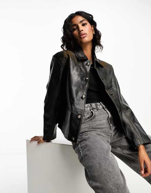 Mango – Capsule – Czarna skórzana kurtka zapinana na guziki