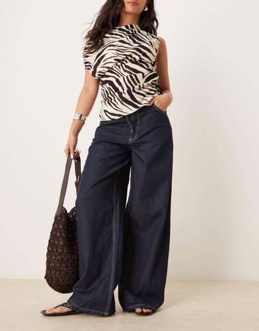 Mango – Ciemnoniebieskie spodnie z mieszanki lnu o jeansowym wyglądzie z szerokimi nogawkami i elastyczną talią