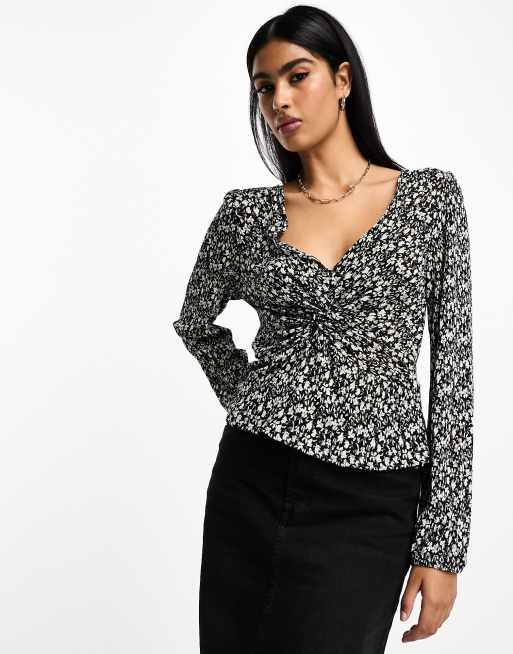 Mango – Czarna bluzka zbierana w talii w kwiatowy wzór